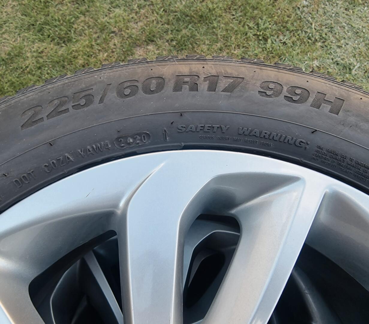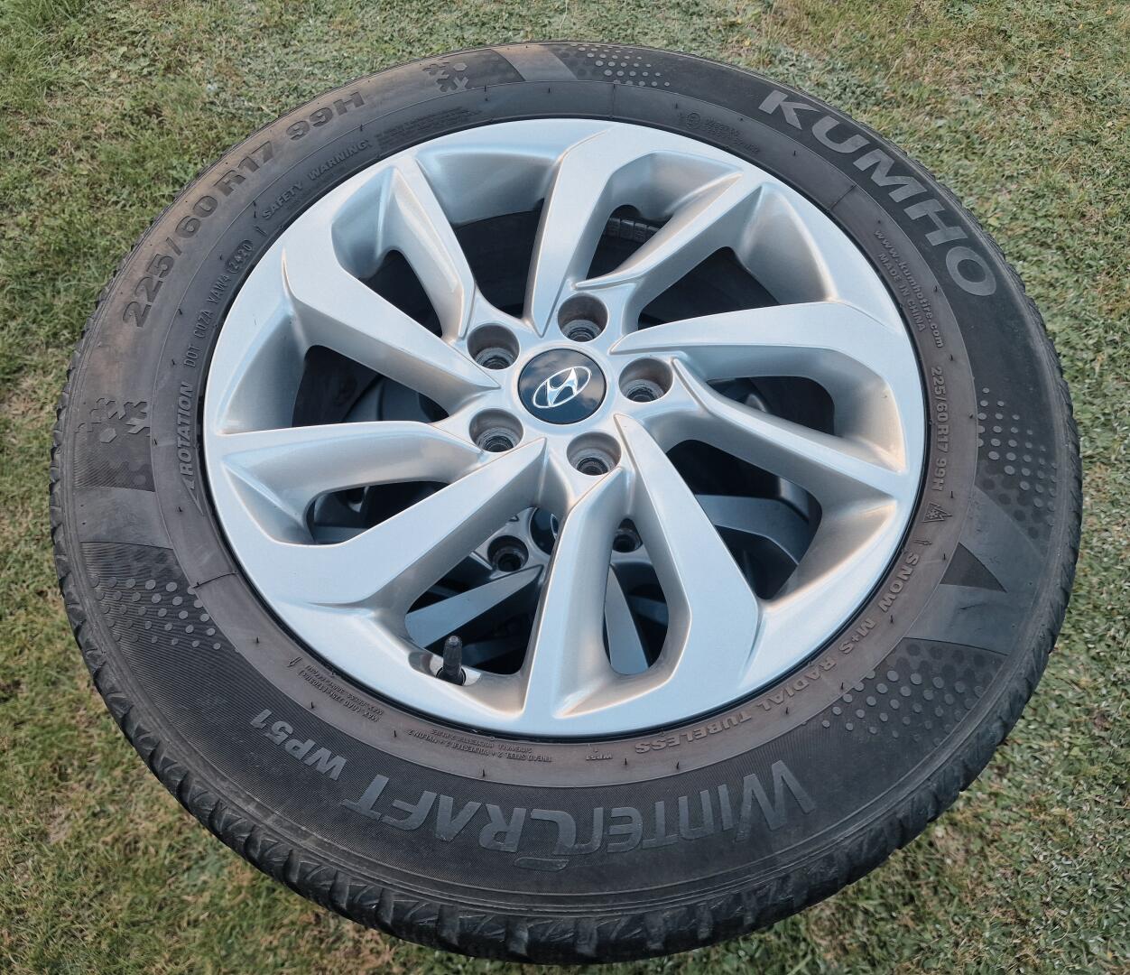 Komplet oryginalnych kół Hyundai (felgi z oponami). Rozmiar 17 cali. Zestaw wraz z czujnikami ciśnienia i dekielkami. Opony Kumho Wintercraft 225/60 (stan jak na zdjęciach).