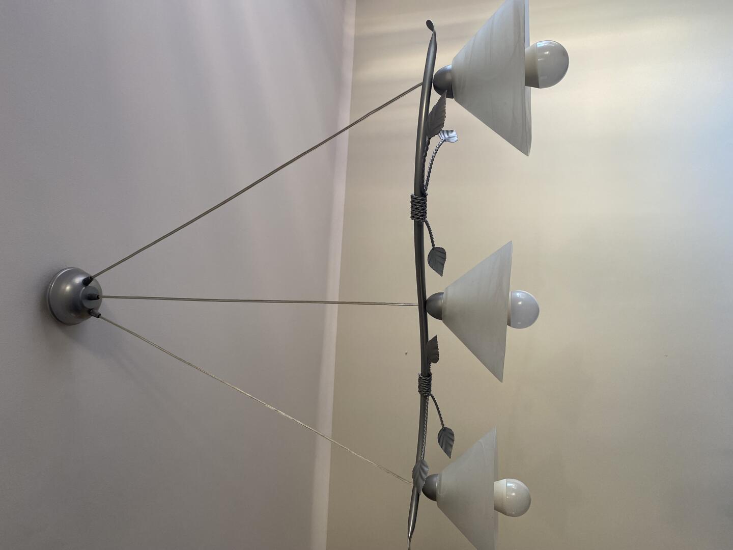 Sprzedam piękny potrójny żyrandol w kolorze srebrnym i białym.
