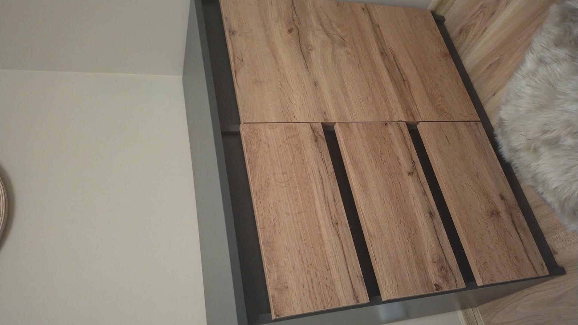 Komodę długości 80 cm, wysokości 75 cm. Kolor dąb wotan, grafit mat. Na górze blat lekko uszkodzony przy rogu ( uszkodzono przy transporcie).